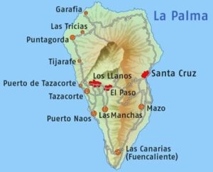 La Palma is een van de acht Canarische Eilanden en gelegen in het noordwesten van de eilandengroep. La Palma is van vulkanische oorsprong en drie miljoen jaar geleden ontstaan op de bodem van de oceaan op een diepte van 3500 meter. De hoogste top, de Roque de los Muchachos is 2421 meter hoog Op La Palma wonen ongeveer 85.000 inwoners. Het eiland is 24 kilometer breed en 42 kilometer lang. De totale oppervlakte is 729 vierkante kilometer. La Palma behoort tot de provincie Tenerife, de hoofdstad is Santa Cruz de La Palma. De bewoners van het mooie eiland worden Palmeros genoemd. La Palma is geliefd bij natuurliefhebbers, rustzoekers en wandelaars. Een van de bijnamen van La Palma is La Isla Verde (het groene eiland). De oorspronkelijke vegetatie op de steile berghellingen van het eiland behoudt het gehele jaar door zijn bladeren, waardoor in de zomer, maar ook in de wintermaanden, de kleur groen domineert.